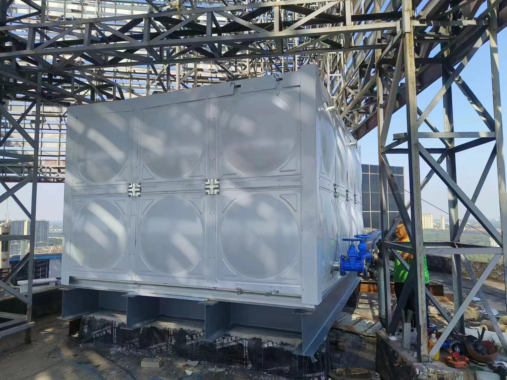 德州德百物流批發城24立方玻璃鋼聚氨酯彩鋼板保溫水箱已經安裝完畢,此次安裝的進度也非常快,在規定的時間內完成了安裝和試水,得到了客戶的認可。您的認可就是對我們鼓勵。